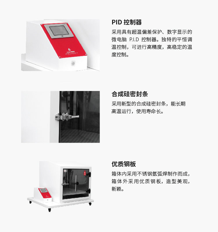 该机采用“PID控制器”“合成硅密封条”“优质钢材”等优质配置。具有高精度,高稳定的温度控制、密封性能好、使用寿命长、造型美观,新颖......等优点。