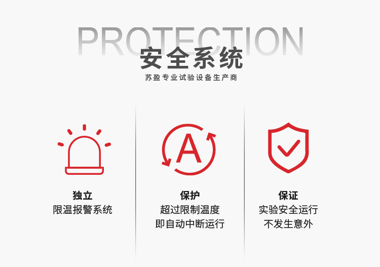 安全方面具有独立限温报警系统、超过限制温度即自动中断运行等保护装置。具有全方位保证实验安全运行不发生意外的特点。